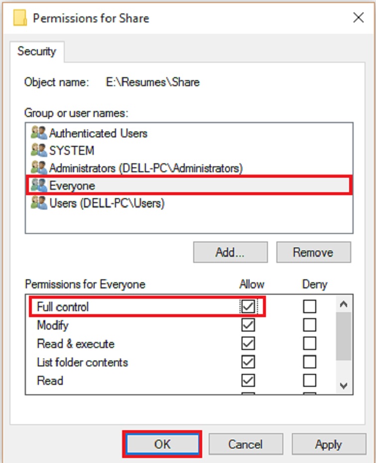 Bước 10: Tại mục Username, bạn chọn Everyone => Đánh vào dấu tích chọn Full Control => Cuối cùng, bạn chọn OK để có thể hoàn tất toàn bộ quá trình.