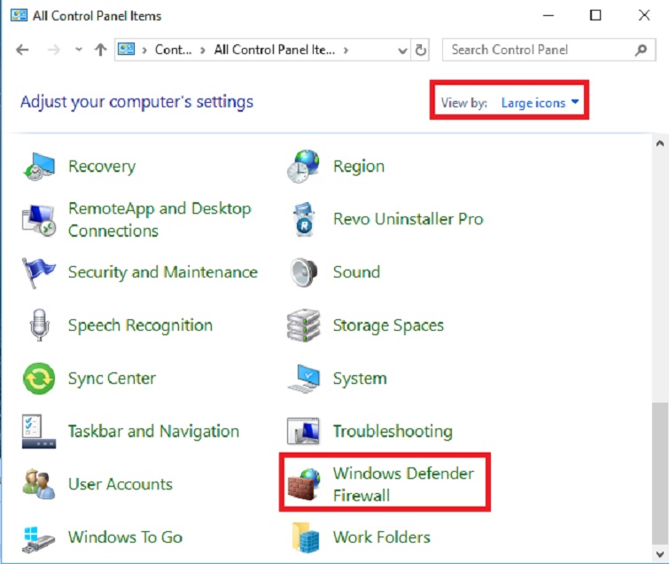 Bước 2: Truy cập vào cài đặt tường lửa của Windows bằng cách tìm kiếm và chọn vào mục "Windows Defender Firewall" (ở chế độ xem Large icons để dễ tìm).