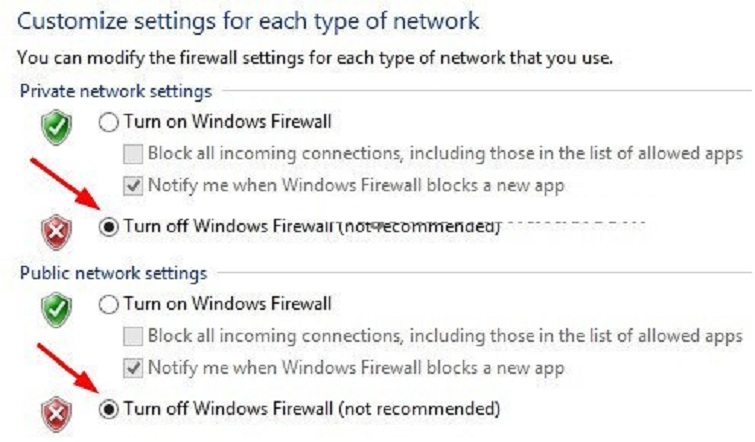 Bước 4: Tại cửa sổ mới, bạn nhấn vào tùy chọn "Turn off Windows Firewall (not recommended)". Nhấn nút OK để lưu lại mọi thay đổi.
