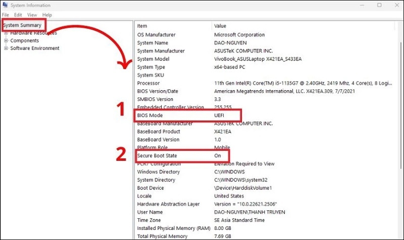 Bước 2: Khi giao diện System Information hiển thị, bạn nhấn vào mục System Summary. Lúc này, bạn tìm kiếm, kiểm tra tại mục BIOS Mode và Secure Boot State.