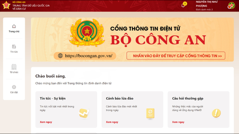 Bước 1: Truy cập website như trên (https://vneid.gov.vn hoặc Cổng Dịch vụ công).