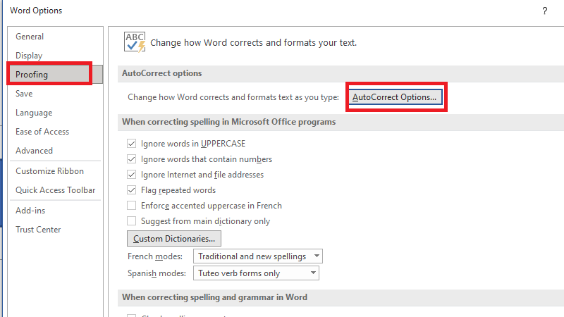 - Vào File > Options > Proofing > AutoCorrect Options.