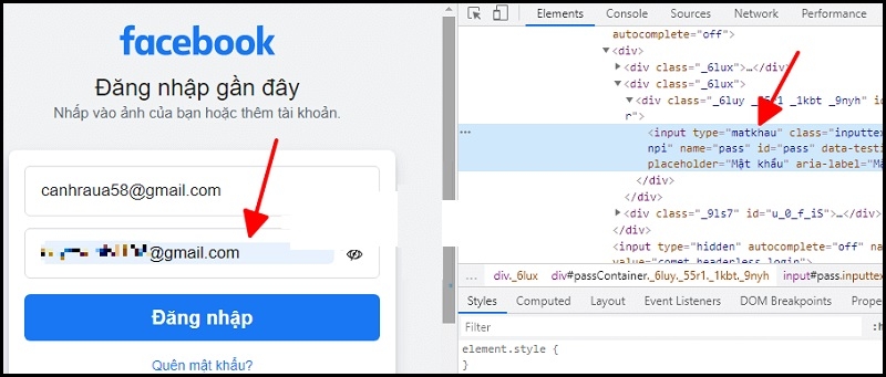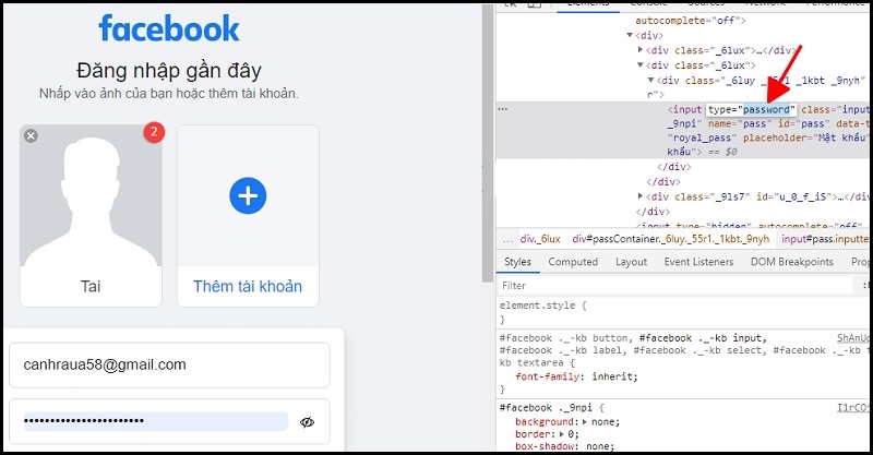 Bước 4: Trong cửa sổ Developer Tools, tìm dòng code có nội dung: input type="password".