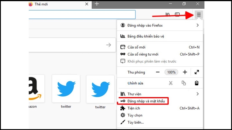 Bước 1: Mở Firefox → nhấp biểu tượng ba gạch ngang (☰) góc phải trên → chọn 'Đăng nhập và Mật khẩu' (Logins and Passwords).