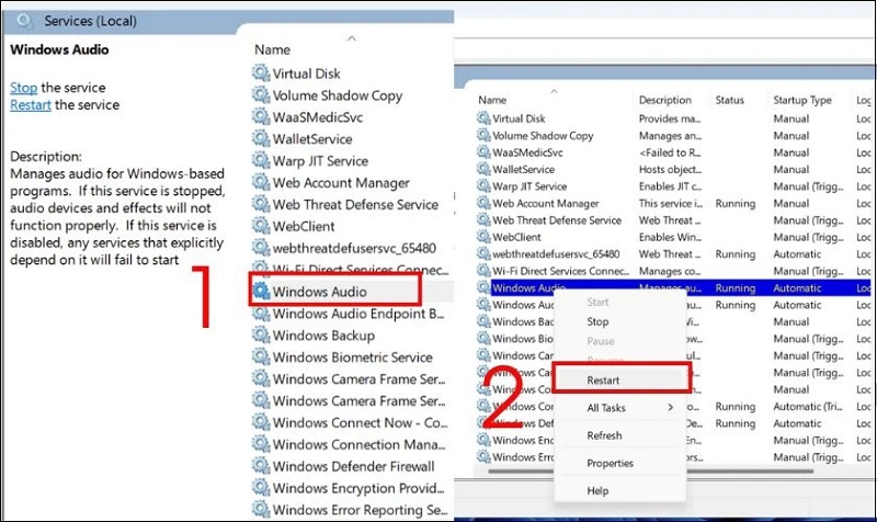 Khởi động lại dịch vụ Windows Audio:
