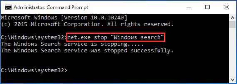 Bước 2: Trong cửa sổ Command Prompt vừa được xuất hiện, type net.exe stop “Windows search”.