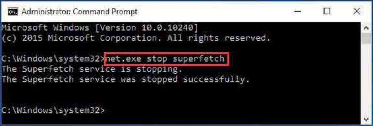 Bước 2: Ở cửa sổ Command Prompt vừa được xuất hiện trên màn hình, type net.exe stop superfetch và nhấn vào Enter.