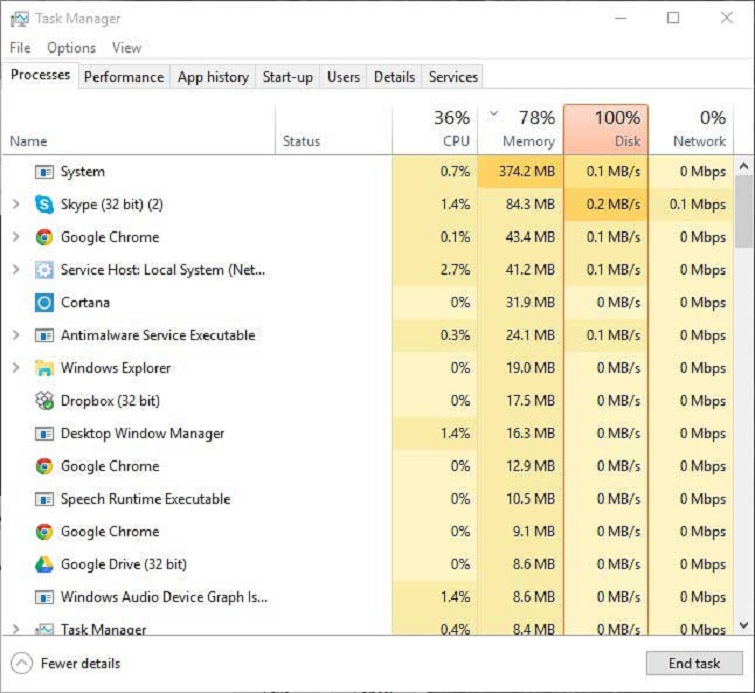 1. Những dấu hiệu của lỗi full disk 100 win 10