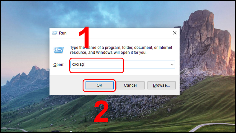 Bước 1: Nhấn Windows + R, gõ "dxdiag" và Enter.