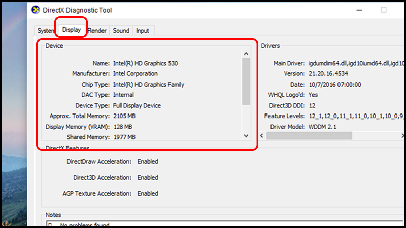 Ở đây, bạn xem tên card, nhà sản xuất, dung lượng VRAM, phiên bản driver. Ưu điểm của DxDiag là hiển thị cả lỗi tiềm ẩn, như vấn đề DirectX, hữu ích cho game thủ.