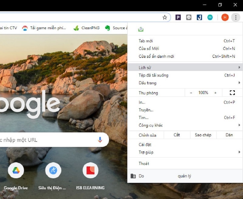 Nhấp vào biểu tượng ba chấm ở góc trên bên phải, chọn Lịch sử (hoặc nhấn tổ hợp phím Ctrl + H).