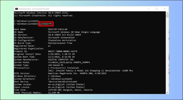 - Nhập "systeminfo" và Enter.