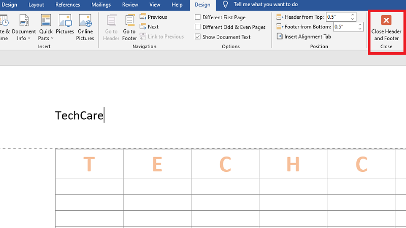 Bước 4: Đóng Header bằng cách nhấp đúp ngoài vùng hoặc chọn "Close Header and Footer".