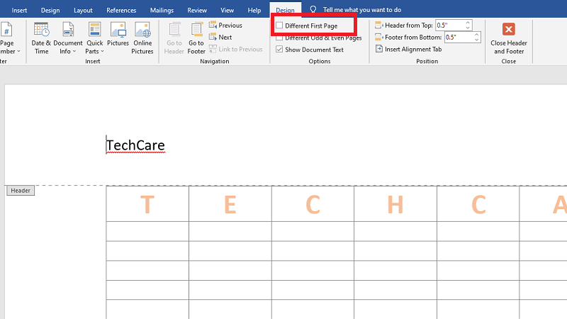 Bước 2: Trong tab "Header & Footer Tools" > Design, tích chọn "Different First Page".