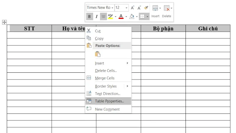 Bước 2: Nhấp chuột phải vào hàng tiêu đề (thường là hàng đầu tiên) và chọn "Table Properties" từ menu hiện ra.