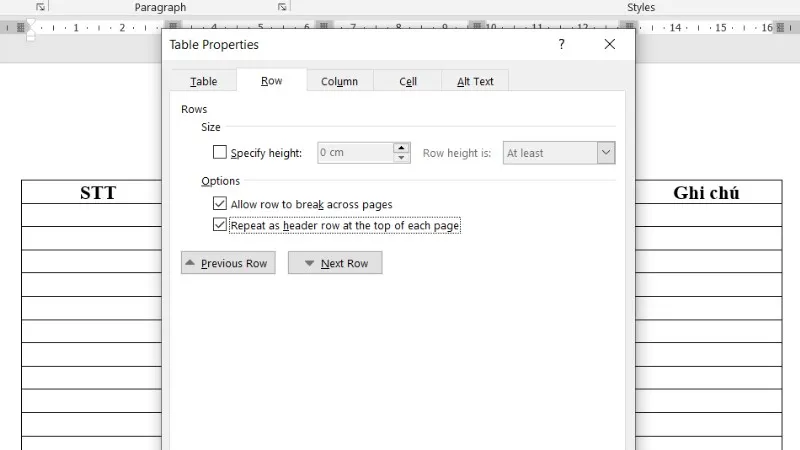 Bước 3: Trong hộp thoại Table Properties, chuyển sang tab "Row".