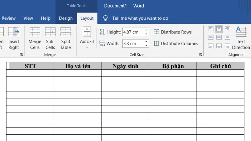 Bước 2: Chuyển sang tab "Layout" (dưới phần Table Tools).