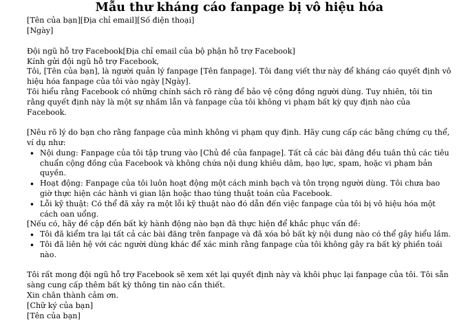 Mẹo từ Techcare.vn: Nội dung kháng nghị phải thể hiện rõ sự hiểu biết về chính sách Facebook và cam kết tuân thủ nghiêm ngặt các quy định.