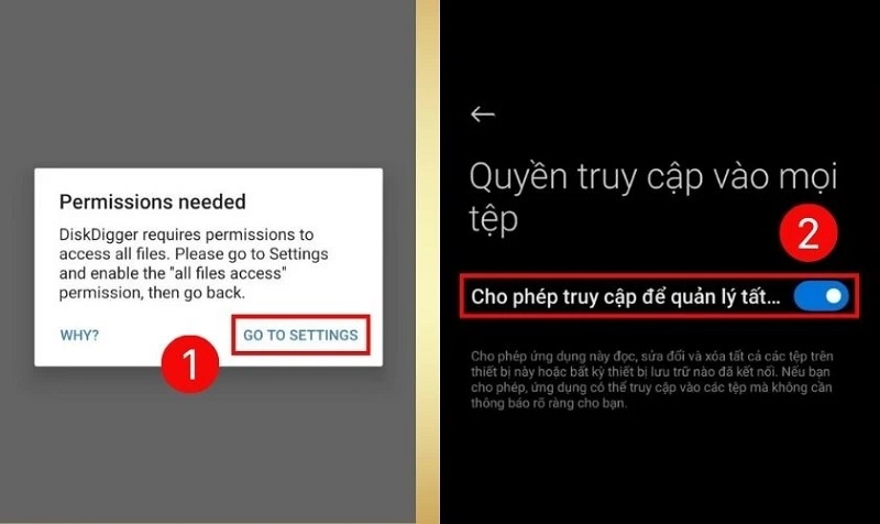 Bước 2: Ngay sau đó, trên màn hình điện thoại sẽ hiển thị yêu cầu truy cập vào thiết bị của ứng dụng. Bạn lần lượt chọn vào mục Đi tới cài đặt >> Gạt thanh trượt ở mục Cho phép truy cập... sang phải.