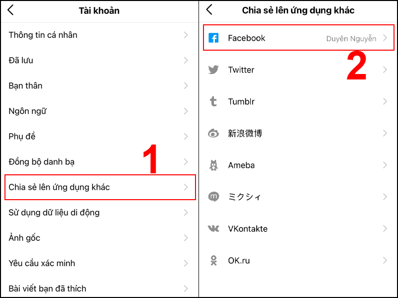 Chọn tài khoản để chia sẻ: Vào mục Tài khoản > Chia sẻ lên ứng dụng khác > Facebook.