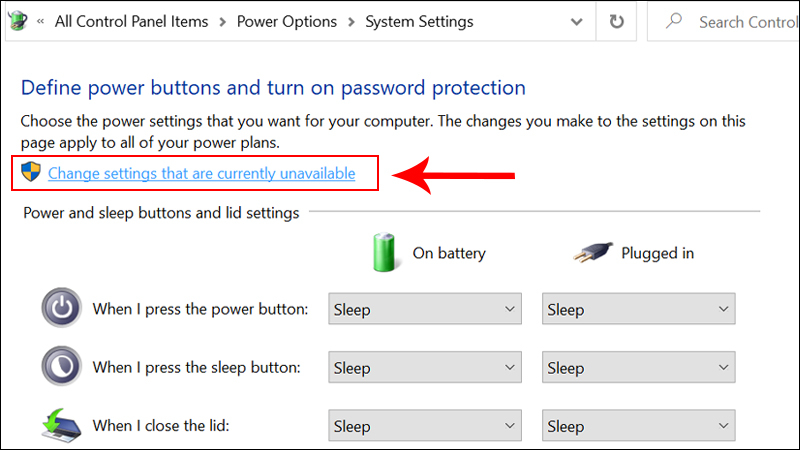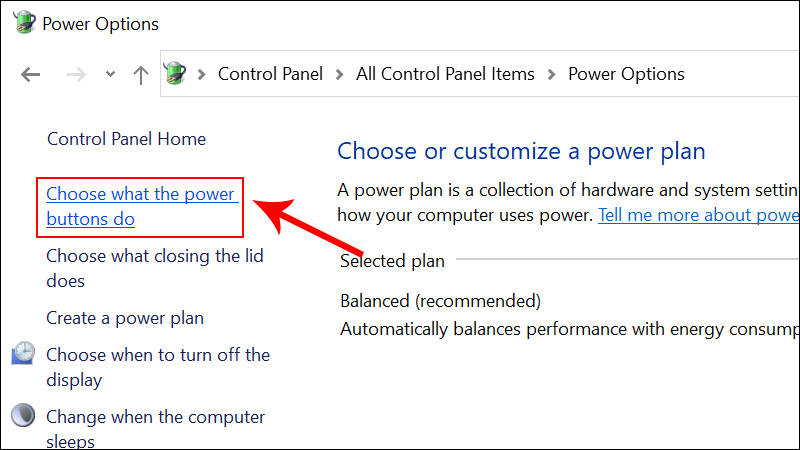 - Chọn "Choose what the power buttons do" ở thanh bên trái