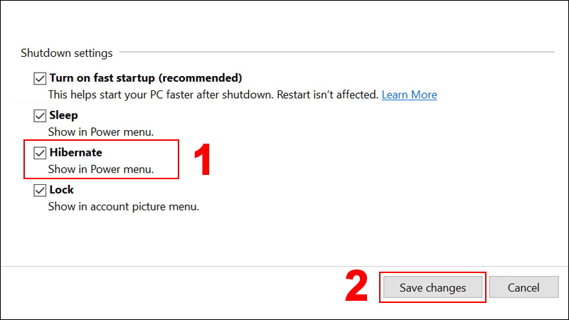 - Tích chọn "Hibernate" trong phần "Shutdown settings"