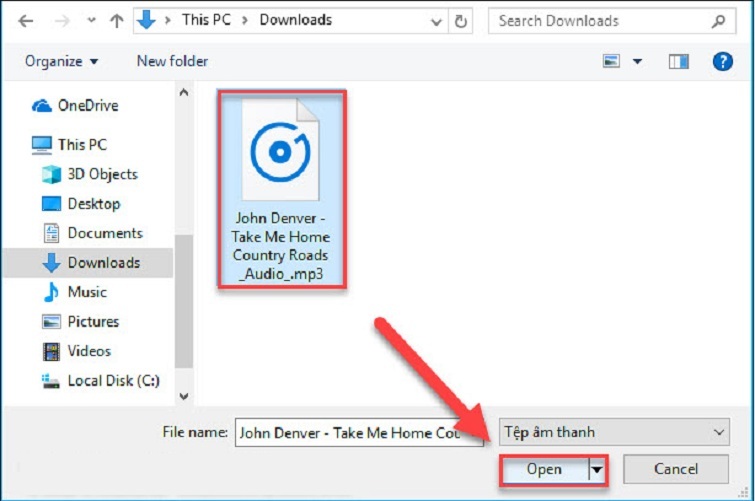 Duyệt đến thư mục chứa file, chọn bài hát mong muốn và nhấn "Open". Quá trình tải lên thường mất vài giây tùy kích thước file.