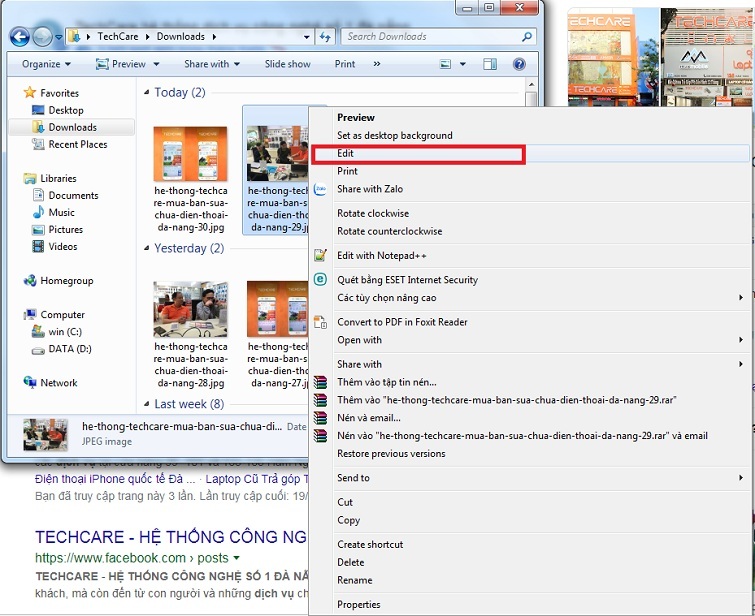 Nhấp chuột phải vào ảnh cần chỉnh sửa, chọn Edit (hoặc Open with > Paint). Phương pháp này tiện lợi cho việc chỉnh sửa nhanh, đặc biệt khi dạy trẻ lớp 3.