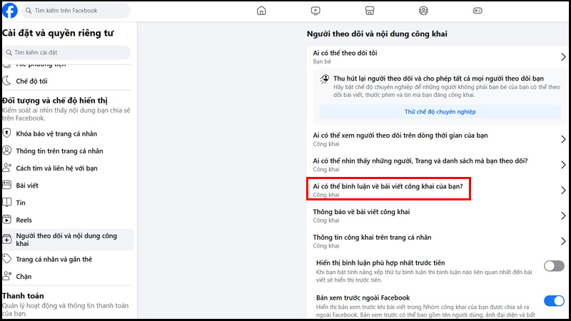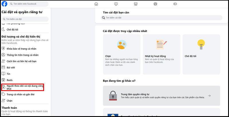 Bước 4: Bạn tìm và chọn vào Người theo dõi và nội dung công khai trong mục Đối tượng và chế độ hiển thị.