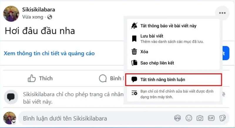 - Nhấp ba chấm (...) và chọn "Tắt bình luận" (Turn off commenting).