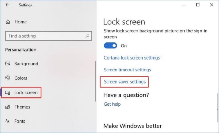 Bước 2: Khi bạn mở cửa sổ mới, hãy chọn Lock screen từ menu bên trái. Tiếp theo, trong cửa sổ bên phải, nhấp vào Screen saver settings để thực hiện cài đặt màn hình chờ.