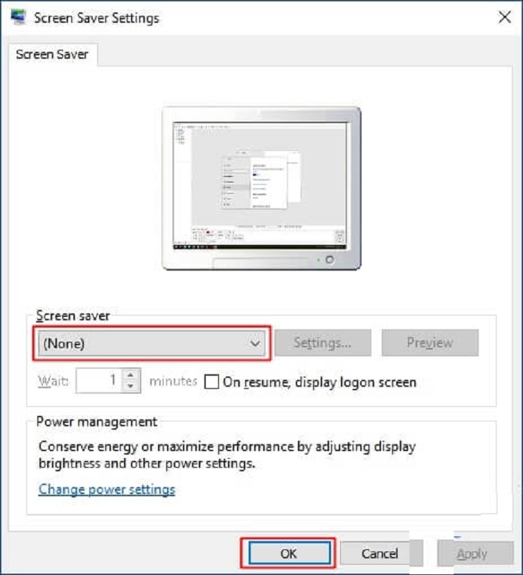 Bước 3: Sau đó, trong cửa sổ hiển thị, tại mục "Screen saver," hãy mở danh sách => Chọn (None) để tắt màn hình chờ trên Windows 10. Nhấn nút OK để lưu lại các thiết lập.