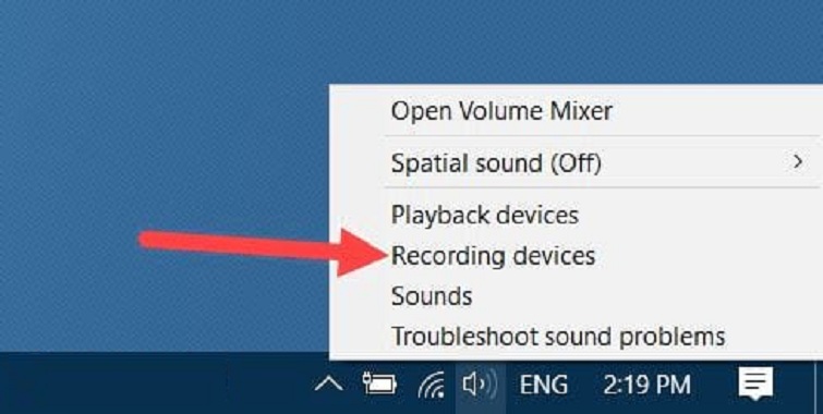 Bước 1: Trước tiên, bạn hãy click chuột phải vào biểu tượng âm thanh ở trên taskbar, rồi chọn vào mục Recording devices.