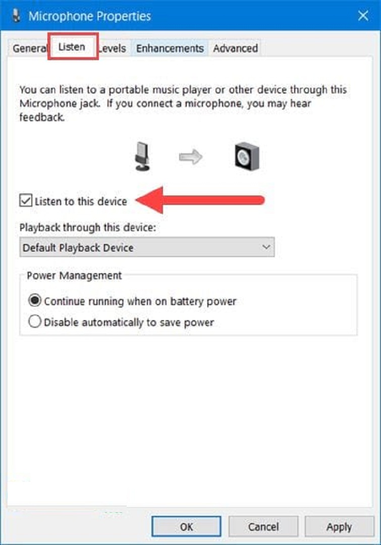 Bước 4: Chuyển đến phần tiếp theo là "Listen", ở đây, bạn chỉ cần đánh dấu vào tùy chọn "Listen to this device". Thao tác này sẽ cho phép bạn nghe lại âm thanh từ microphone của người khác, giúp bạn kiểm tra chất lượng âm thanh khi họ sử dụng microphone.