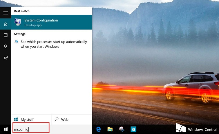 Bước 1: Đầu tiên, các bạn gõ lệnh msconfig vào khung Search ở trên thanh Taskbar để mở cửa sổ System Configuration lên.