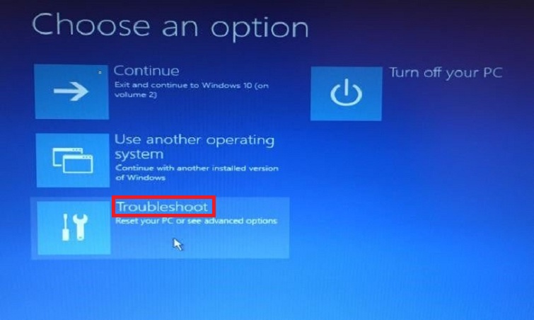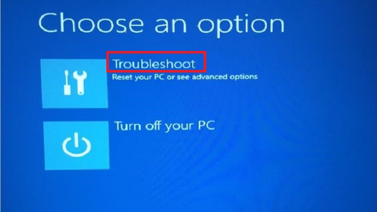 Bước 3: Đến đây bạn sẽ thấy màn hình Choose an option xuất hiện. Lúc này bạn click chọn vào Troubleshoot.