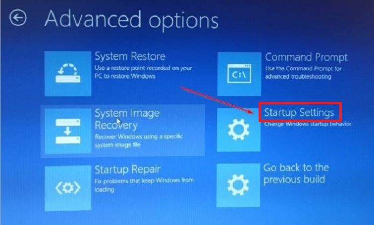 Bước 5: Tiếp theo, trên màn hình máy tính xuất hiện cửa sổ Advanced options, bạn hãy click chọn mục Startup settings.