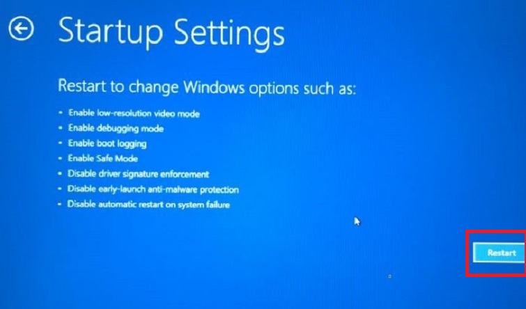 Bước 6: Cuối cùng, trên cửa sổ Startup Settings, bạn nhấn chọn Restart để khởi động lại máy tính.