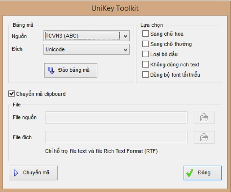 Trong quá trình làm việc với mã nguồn, hãy lựa chọn TCVN3 nếu bạn đang sử dụng mã nguồn này. Trong trường hợp bạn đang làm việc với mã nguồn khác, hãy chọn mã nguồn đó một cách chính xác. Thường thì mã nguồn đích sẽ là Unicode.