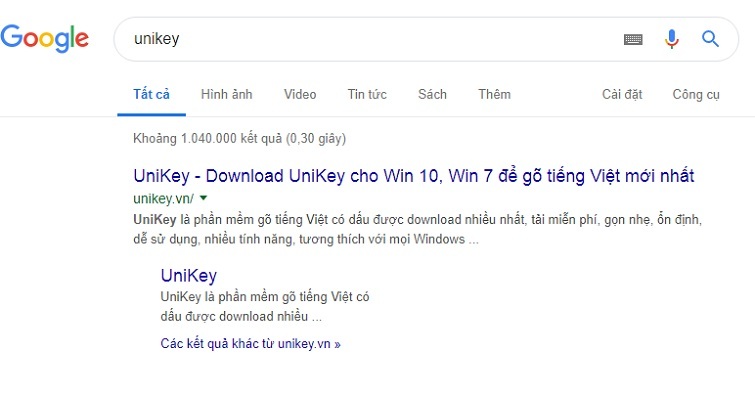 Để thành công trong việc cài đặt cách viết có dấu trong máy tính, bạn cần truy cập vào trình duyệt Google Chrome. Sau đó, nhập từ khóa "unikey " vào ô tìm kiếm. Kết quả tìm kiếm sẽ hiển thị như hình dưới đây. Bạn chỉ cần nhấn vào tùy chọn "Download Unikey" hoặc tải trực tiếp tại đây để tải phần mềm về máy tính của bạn.
