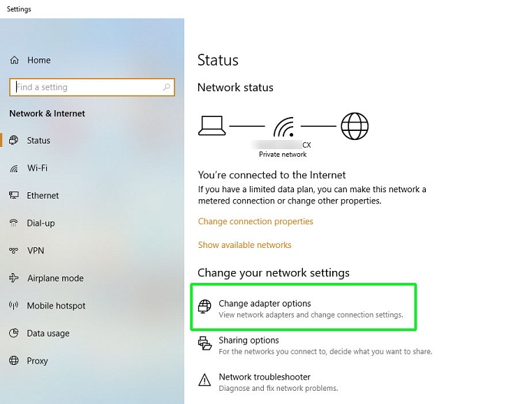 Tương tự, bạn cũng có thể truy cập lựa chọn ‘Change Adapter options’ bằng cách nhấp chuột vào nút ‘Start’. Sau đó, chọn ‘Settings’ và cuối cùng là nhấn vào ‘Network and Internet’. Tại đây, trong phần bên phải của ‘Change your network settings’, các bạn sẽ tìm thấy tùy chọn ‘Change Adapter options’.