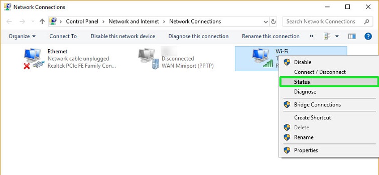 Bước 3: Trong cửa sổ tiếp theo xuất hiện, hãy tìm card mạng WiFi của bạn, sau đó nhấn chuột phải vào nó và chọn ‘Status’.