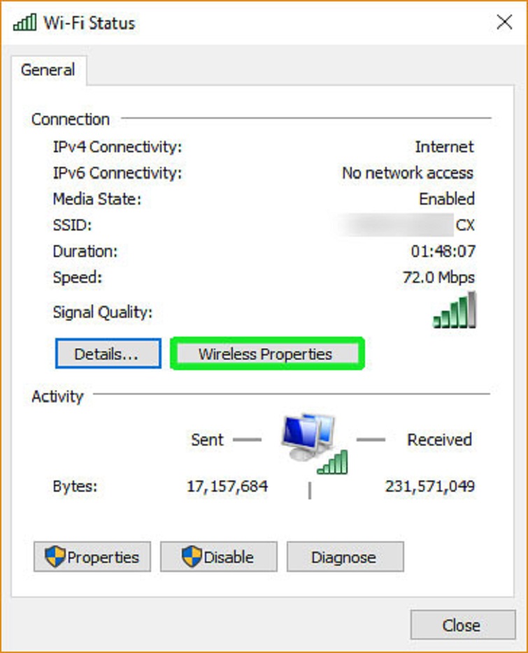 Bước 4: Trong cửa sổ Wi-Fi Status vừa được hiển thị, bạn nhấp vào nút ‘Wireless Properties’.