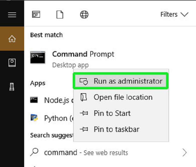 Bước 2: Sau đó, click chuột phải vào kết quả và chọn ‘Run as Administrator’, sau đó nhập lệnh dưới đây vào: