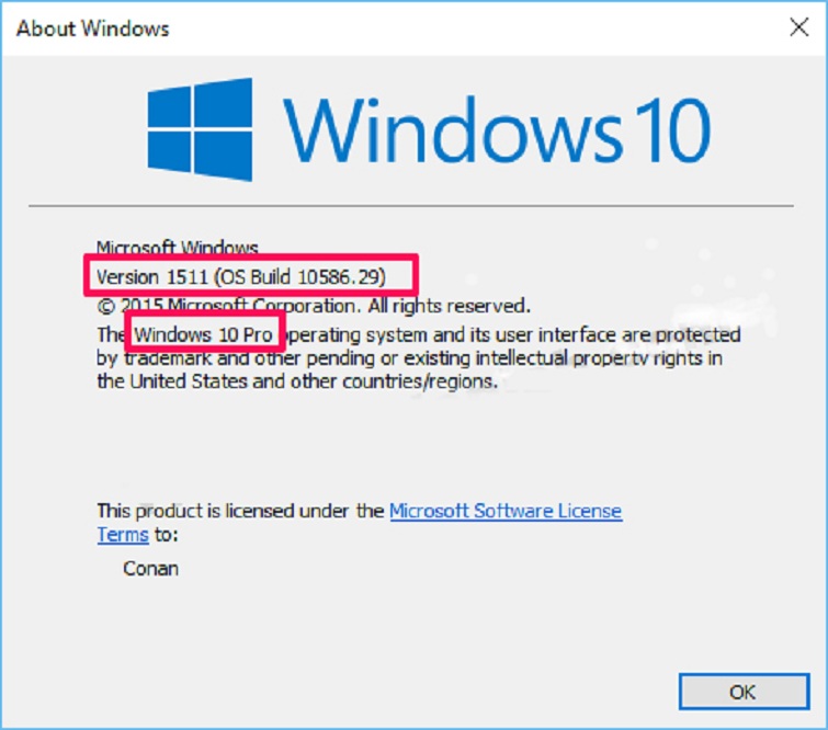Bước 2: Khi đó, bạn sẽ thấy cửa sổ "About Windows" xuất hiện, hiển thị các thông tin về Windows 10 bạn đang sử dụng, bao gồm: Phiên bản – Home/Pro/Enterprise hoặc Education (Edition), số phiên bản (Version), và Build. Trong ví dụ dưới đây, đó là Windows 10 phiên bản Pro với số phiên bản (Version) là 1511 và Build là 10586.29.