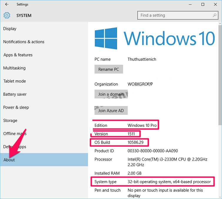 Bước 3: Tiếp theo, hãy chọn "About" trong menu ở phía bên trái. Lúc này, bạn sẽ thấy các thông số chi tiết về Windows 10 mà bạn đang sử dụng được hiển thị, bao gồm: Phiên bản (Edition), số phiên (Version), và Build, cũng như kiểu hệ điều hành 32-bit hoặc 64-bit (System type).