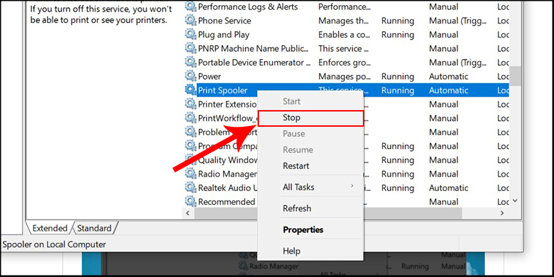 Bước 2: Dừng Print Spooler: