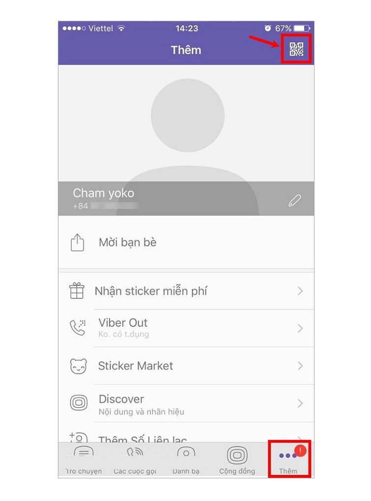 Bước 5: Sau đó, bạn mở ứng dụng Viber trên điện thoại và chọn mục "Thêm ". Nhấn vào biểu tượng mã QR nằm ở phía trên bên phải của giao diện.