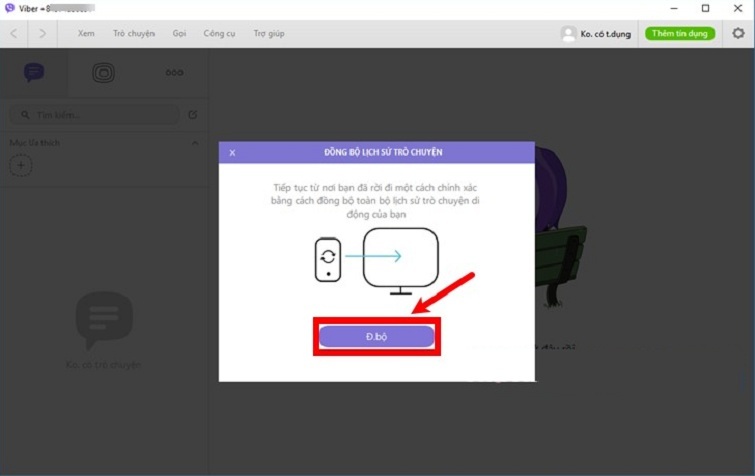 Bước 6: Khi camera điện thoại nhận diện thành công QR Code, hệ thống sẽ tự động thực hiện quá trình đăng nhập Viber trên máy tính. Sau đó, bạn sẽ được chuyển đến giao diện Viber trên máy tính. Ban đầu, Viber sẽ yêu cầu bạn thực hiện đồng bộ lịch sử trò chuyện. Nếu bạn muốn đồng bộ trên cả điện thoại và máy tính, hãy chọn tùy chọn "Đồng bộ". Ngược lại, nếu không muốn thực hiện đồng bộ, bạn có thể đóng cửa sổ đồng bộ bằng cách nhấn vào dấu x.