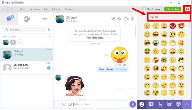 Để thực hiện bỏ kích hoạt tài khoản Viber cho máy tính, bạn chọn vào biểu tượng Cài đặt >> Cài đặt.